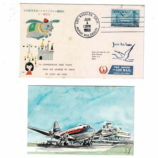 One of the most amazing and interesting pieces in the collection is an envelope celebrating the first flight from Lost Angeles to Tokyo by Japan Airlines in 1959. This is a crossover piece of memorabilia, as not only is it related to stamp collection, with a great 1946 25¢ United States Air Mail stamp of a plane flying over the San Francisco Bay Bridge, but it is also related to airline history through Japan Airlines as well as Disney history. The envelope includes recognizable imagery from the Disney pantheon, including Dumbo and Sleeping Beauty’s Castle. It is an indicator of the burgeoning role Disneyland was playing within worldwide tourism at the time, having only opened just four years earlier.