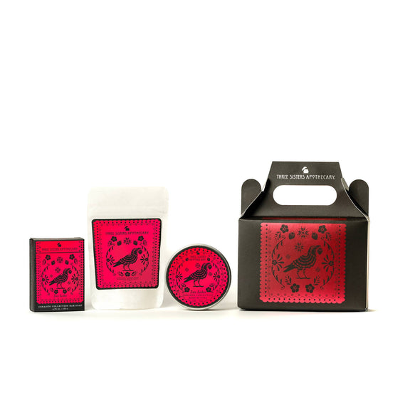 Designed as complete rituals of care, each featuring a handcrafted artisan bar soap, a rich body butter, and a travel bath salt soak. Every set is accompanied by festive swag—a custom enamel pin and a collectible sticker—presented in packaging inspired by ephemeral Papel Picado as a tribute to the artistry and vibrancy of Mexico.