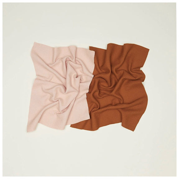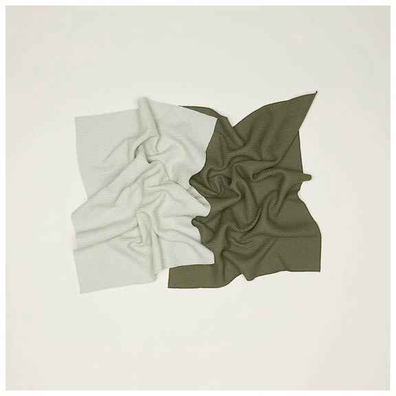 - A set of 2 soft waffle weave kitchen towels in complementary shades
