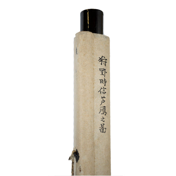 This kakejiku 掛け軸 (hanging scroll) is signed 時信 after 狩野時信 Kano Tokinobu. This work is an utsushi 写し (copy). An utsushi is more than just a copy though, a good utsushi is a work in conversation with the original artist’s work. The mounting of this scroll includes multiple types of paper and a cute brocade with rabbits on it.
