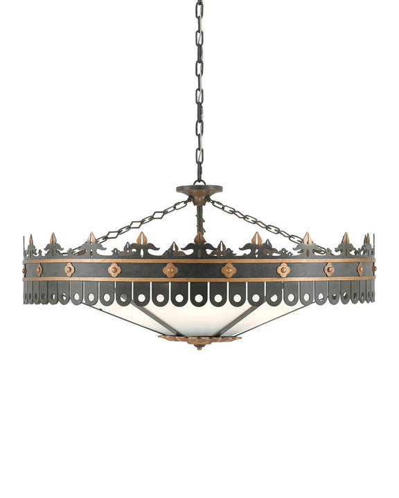 Inspired by the detail from an English garden folly from the early 19th century. In a dexterous mix of antique gold and moss gray finishes, the gray and gold chandelier has classical details accentuated by the contrast in hues.