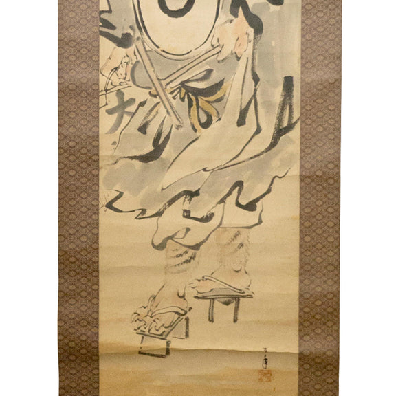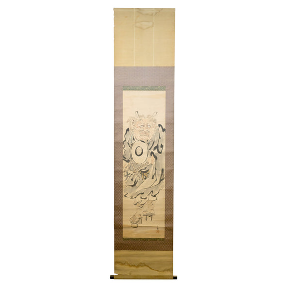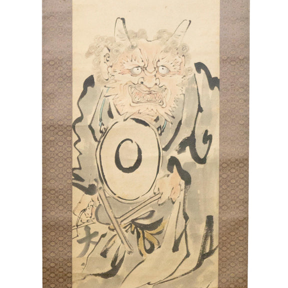 Expressive kakejiku 掛け軸 (hanging scroll) with imagery of an oni 鬼 (demon) dressed as a priest. Popular subject matter speaking to corruption. Labeled on outside 小倉井又. There is one red stamped seal. Untranslated signature. The mounting of the scroll includes two types of silk brocade in browns and golds.