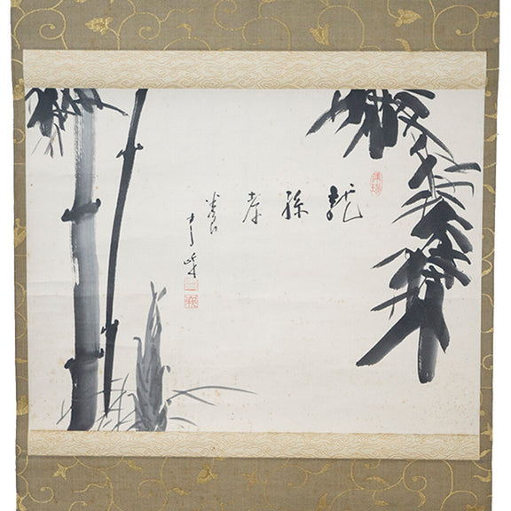 Japanese hanging scroll with bamboo framing a four character series of calligraphy including 孝 filial piety. Untranslated signature with three seal stamps including 峩. Mounted with three silks.