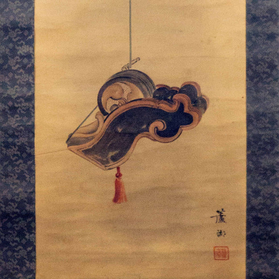 Handsome kakejiku 掛け軸 (hanging scroll) from Japan with imagery of a sumitsubo 墨つぼ (ink line used in carpentry). Striking use of negative space. Signed 益田蘆湖. There is one red stamped seal. The mounting of the scroll includes two types of silk brocades in golds and blues.