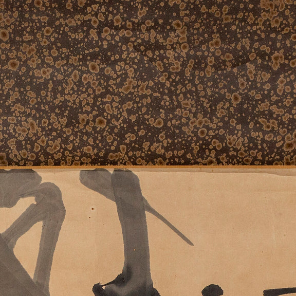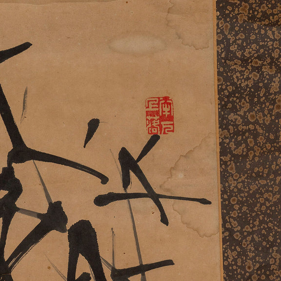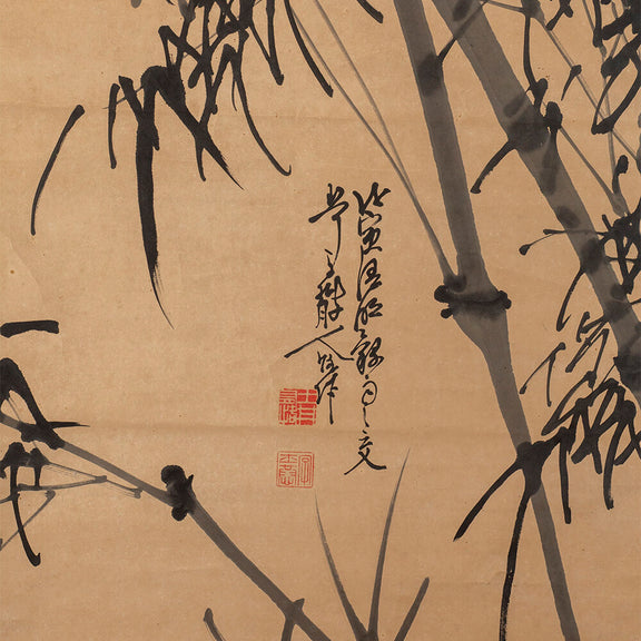 Japanese scroll with black ink imagery of bamboo. Untranslated lines of kanji in the center along with three seal stamps.