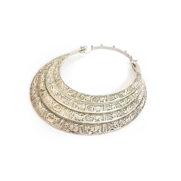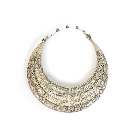 Handmade Miao silver necklace. This could be made of "bai tong" or white copper which is a cupro-nickel. Without doing proper tests it is virtually impossible to distinguish it from real silver. The material has been used in China by the Miao and others since around the 12th century by those whose status has not allowed them to use real silver. Miao are mountain-dwelling peoples of China, Vietnam, Laos, Burma, and Thailand