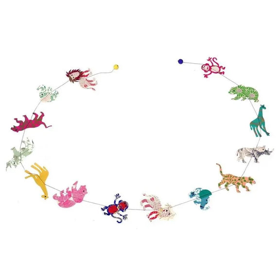 Introduce a touch of whimsy to your space with a stunning paper garland featuring an array of zoo animals. These banners are expertly handcrafted in Nepal by local artisans, using the bark of the Daphne plant, also known as Lokta. Enjoy the intricate workmanship and the charm it brings to any space, perfect for kids' rooms or any part of your home.