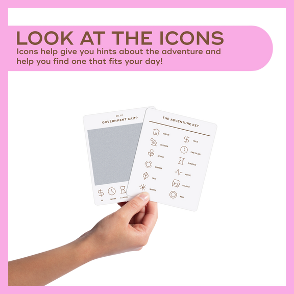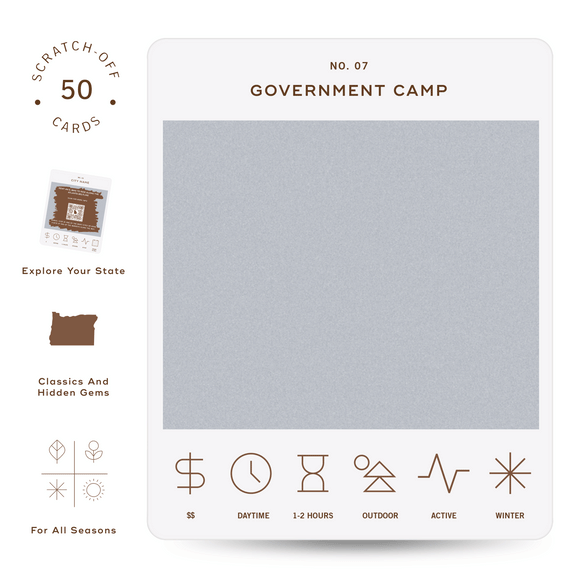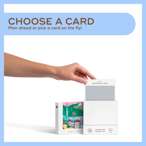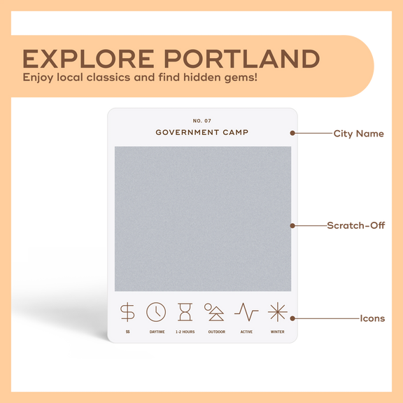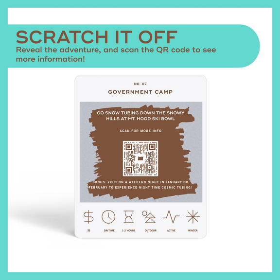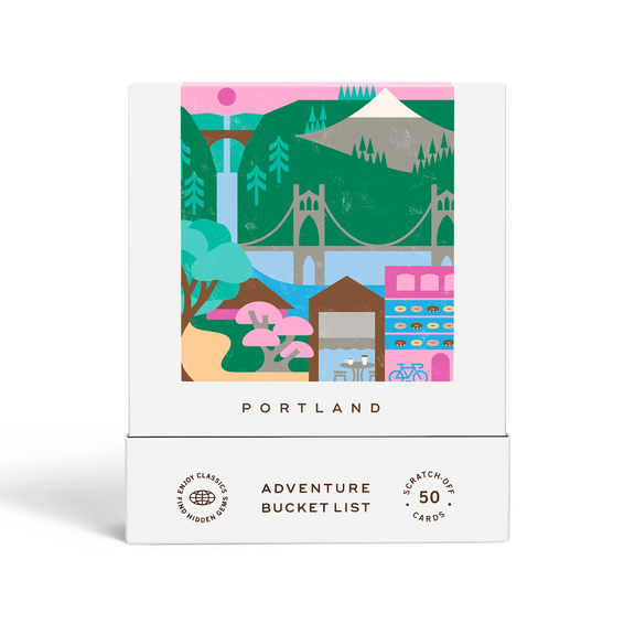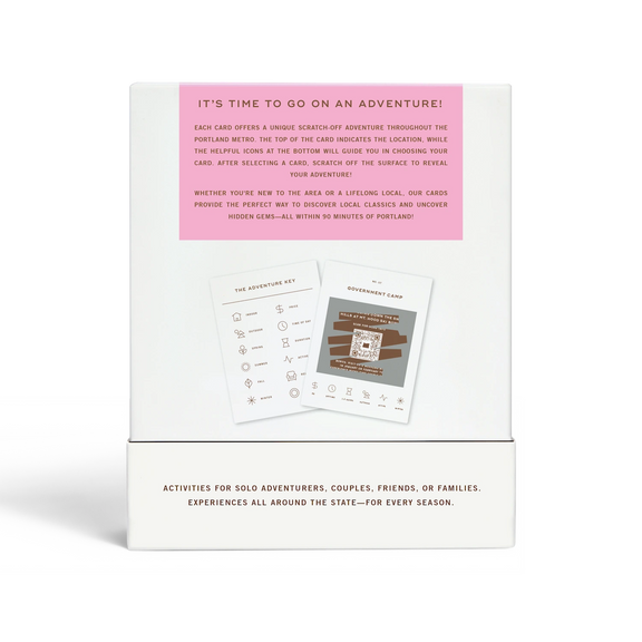 50 scratch off bucket list adventures all within one hour of the city of Portland. Pick an area of the city that you want to explore, check out the icons at the bottom of the card to determine the season, cost, and time of day, and then scratch off the card to reveal your adventure!