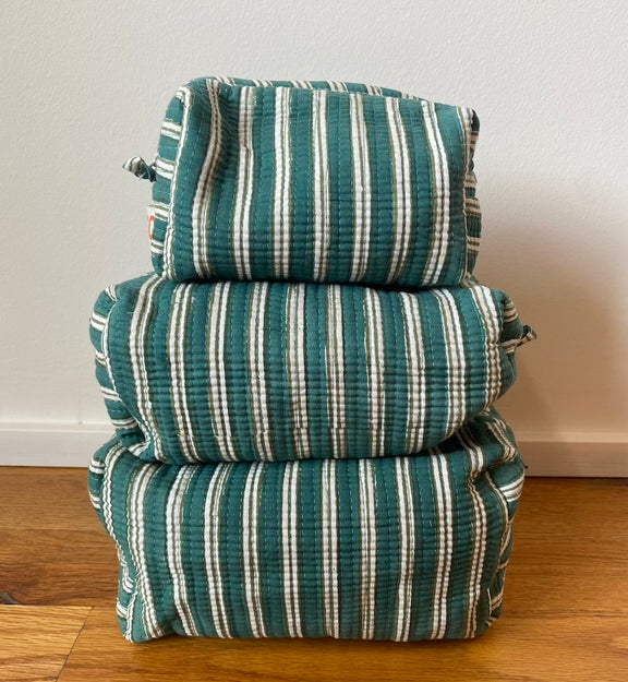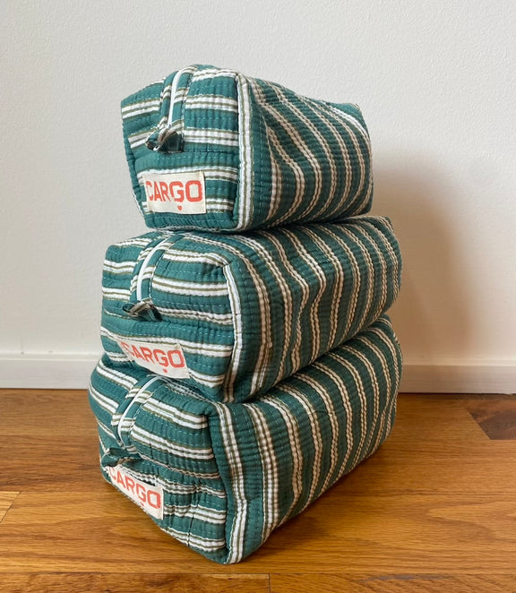 These functional quilted dopp kits come in 3 sizes, with a zippered top and a small interior pocket. Perfect for gifting, storage or travel.