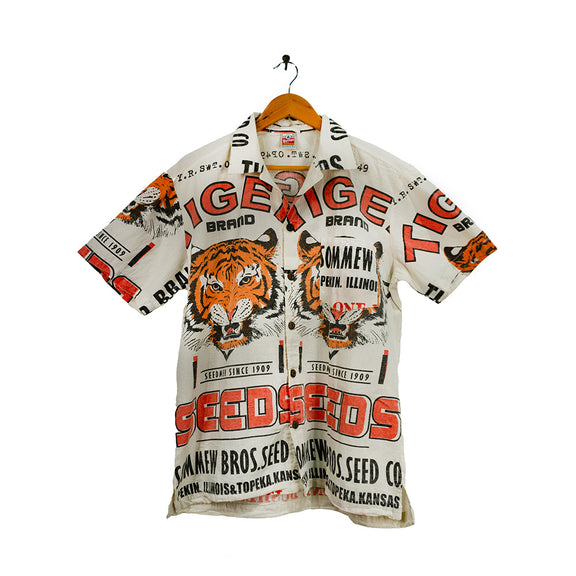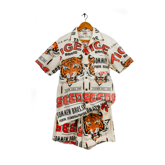 This short-sleeve button-up shirt is crafted from raw cotton. The all-over print is inspired by retro seed sack graphics, prominently featuring tiger illustrations, bright orange and red typography. With a boxy, relaxed fit and classic collar, it pairs utilitarian roots with standout style. The natural, unbleached cotton gives it a rugged texture. All garments are unisex.