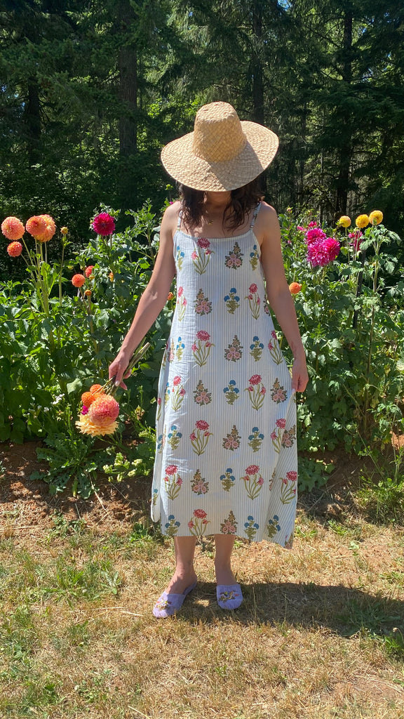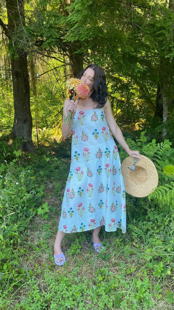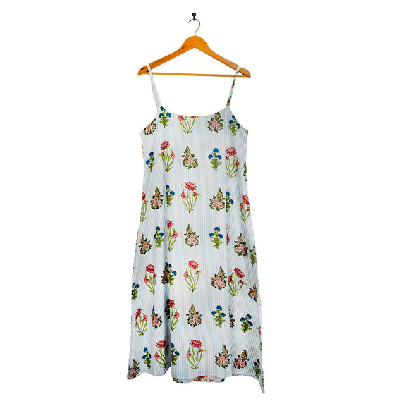 This 100% cotton dress is a breezy, summer-ready piece with a relaxed, A-line silhouette that falls mid-calf. The fabric features a subtle blue-and-white pinstripe base adorned with a charming floral print in shades of pink, blue, and green. The neckline is a gentle square shape with slender shoulder straps, giving it a light and airy feel perfect for warm days.