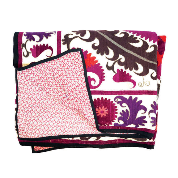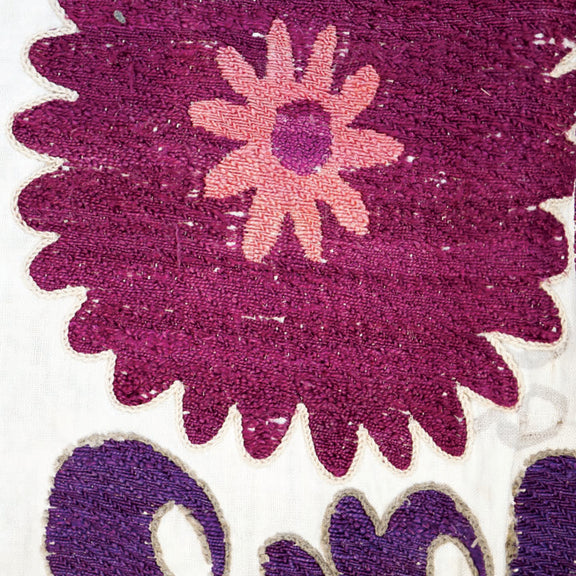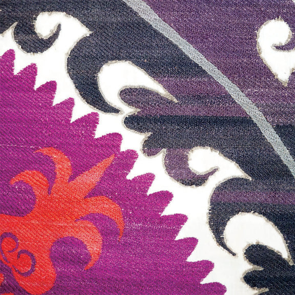 This impressive suzani features the large scale sun disc and flower motif in an unusual blend of colors including ebony, eggplant, burgundy, russet and periwinkle grey. Backed in Czech cotton, edge bound in black cotton.