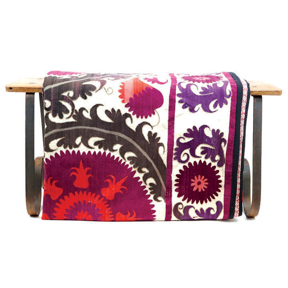 Suzani, named after the Persian word for “needle”—were used as bedcovers, prayer mats, rugs in yurts, and blankets to wrap goods for moving. For centuries, women stitched together long strips of cotton and embellished them to form blanket-sized panels that became the workhorses of nomadic households in Tajikistan, Uzbekistan, Kazakhstan, and other Central Asian countries.