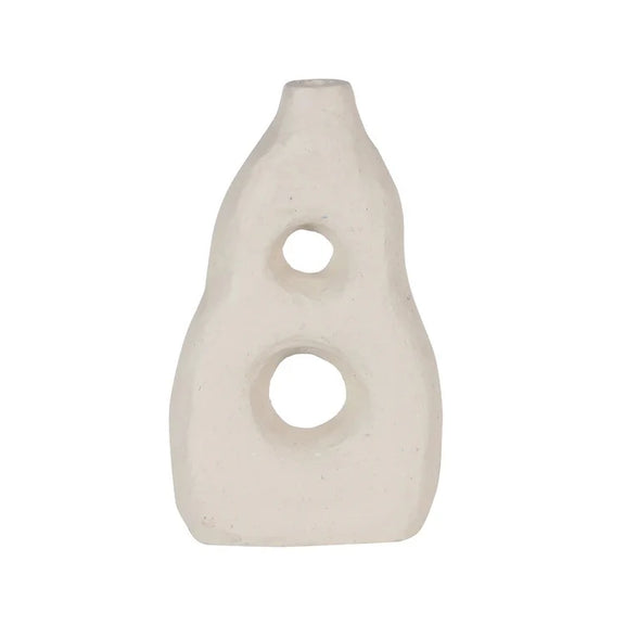 This Paper Mâché Vessel is hand-crafted in India. Each vessel has a fibrous texture and a creamy white hue, with an opening at the top that can hold a dry floral accent.