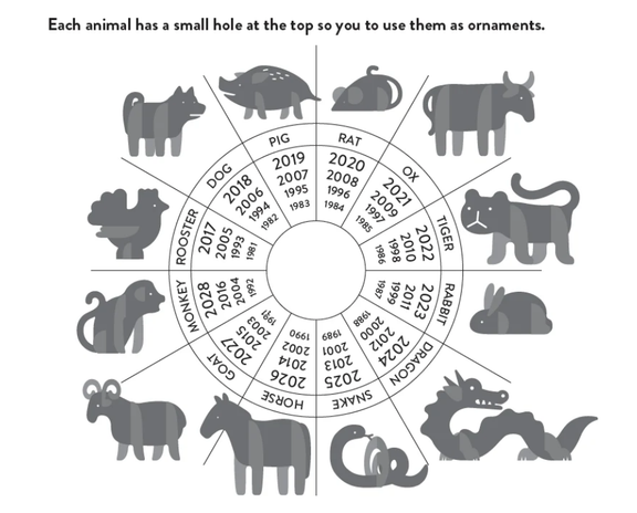 Each year and the people born in that year are often assigned attributes and characteristics of each animal. Every twelve years, the cycle starts over. Kit is made of plywood and is unpainted. Decorate with acrylic paint or markers. Approximate dimensions to largest animal 4.5" Instructions included and as well as a grid matching birth years to the appropriate animal.